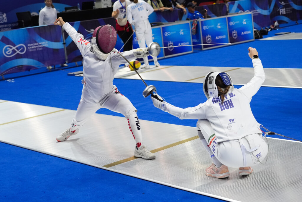 Némiképp szokatlan módon a női párbajtőrözők kezdték később a napot, de végül majdnem egyszerre fejezték azt be – hasonlóan sikeresen. Mivel Csobó Dominik vezetőedző még “újonc a vb-kispadon”, ezért a kiemelt Muhari Eszti edzőjéhez, László Istvánhoz fordultunk, hogy mikor volt legutóbb négy vívónk a 64-ben. “Három évvel ezelőtt, a kairói vb-n. Akkor Kun Anna és Eszti mellett Nagy Kinga és Büki Lili lett főtáblás” – érkezett kapásból a válasz. Most pedig párizsi olimpiai bronzérmesünk mellé Gnám Tamara, Dékány Kinga és a még junior, korosztályos vb-ezüstérmes Nagy Blanka került. Tami egészen kiváló vívással, veretlen csoportkör után. Kinga és Blanka egyaránt 3/3-mal zárt, és két-két további asszó várt rájuk, amit mindketten egészen simán hoztak le. Kinga 14:8-ra (Martinez, Venezuela), majd 15:7-re (Boone, Hollandia), Blanka pedig 15:5-re (Wu, Hongkong), majd 15:8-ra (Ion, Románia).